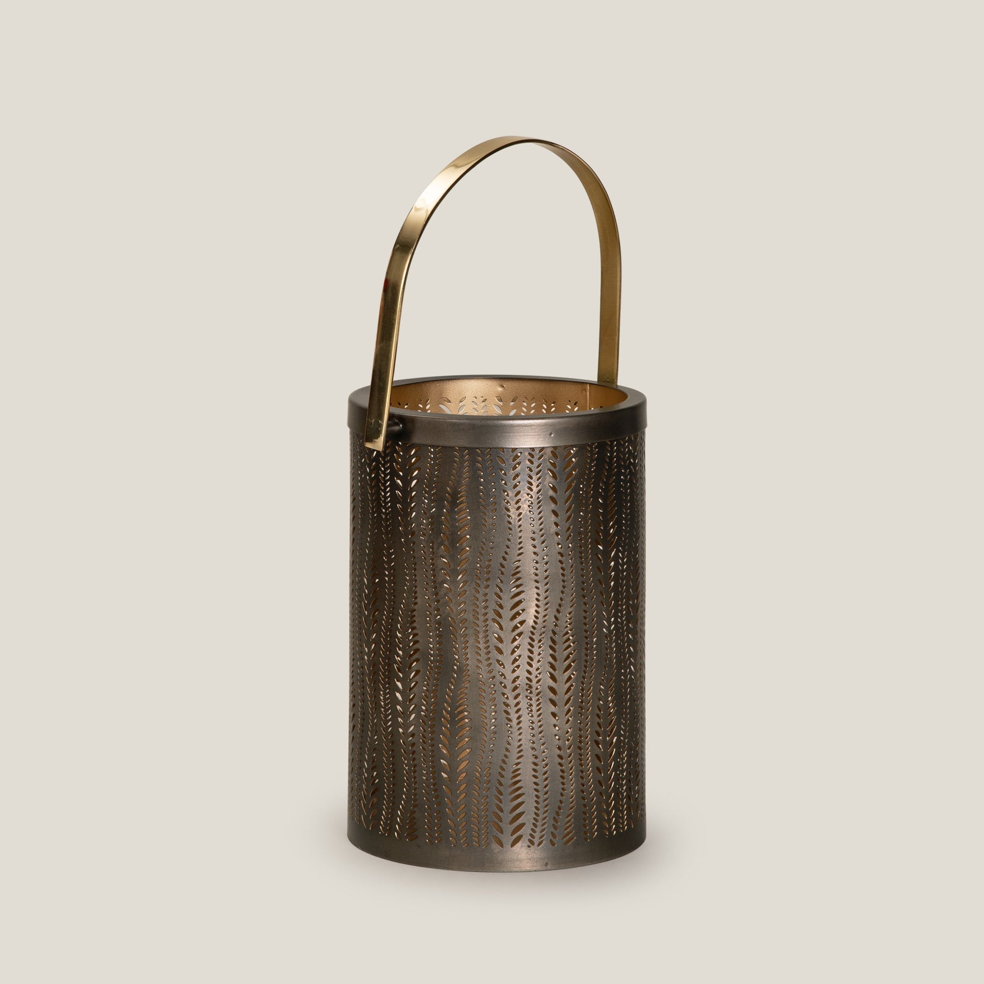 Our Lyla Antique Grey Metal Lantern is where old-world charm meets modern artistry. Crafted in a cylindrical form, its antique grey finish is adorned with delicate leaf-patterned perforations that cast enchanting light patterns when lit. The gold-toned inner lining and sleek handle add a warm, luxe contrast, making it a perfect accent for both indoor ambience and outdoor soirées. Timeless in design, Lyla transforms candlelight into a statement of elegance.
