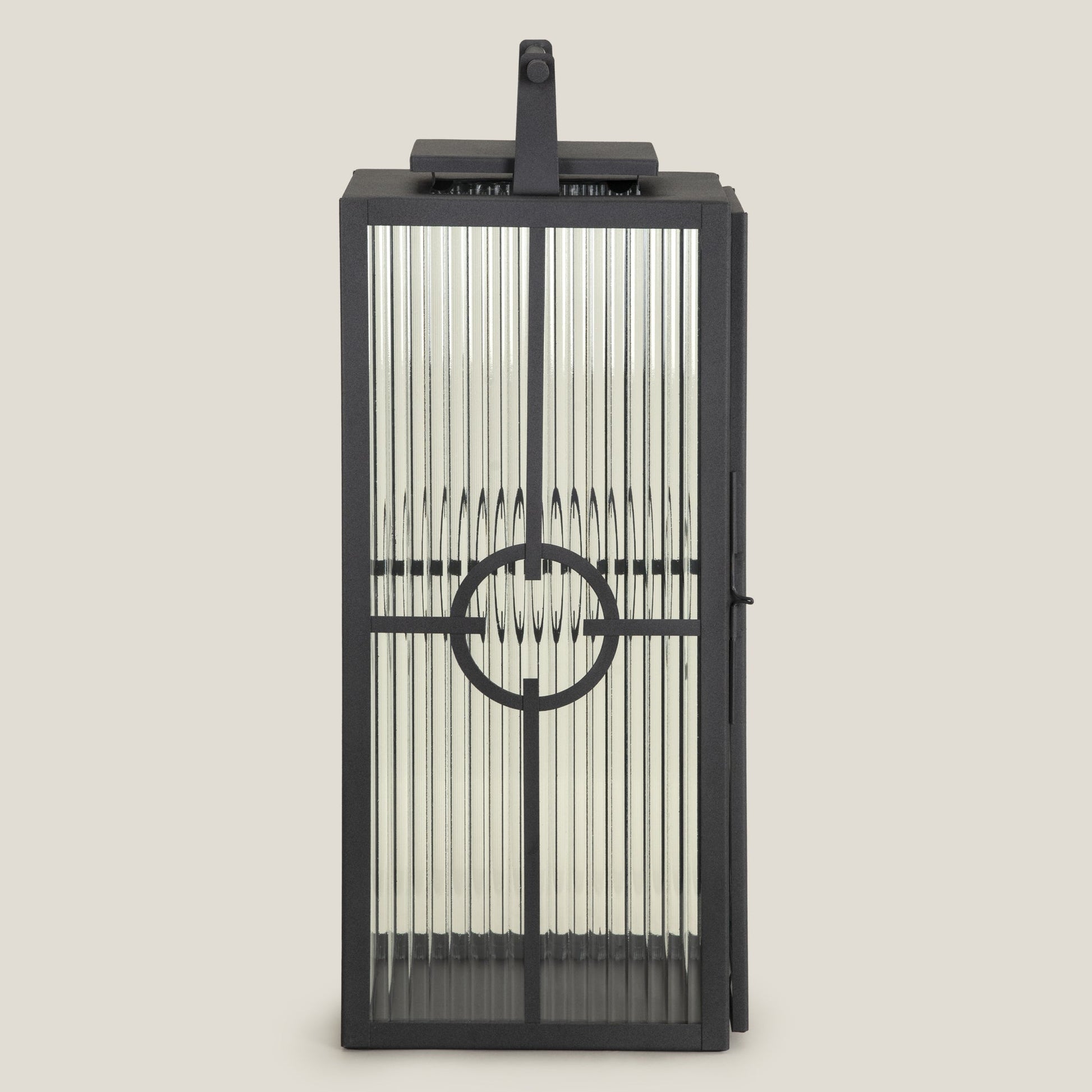 Tavern showcases a sleek modern design. Its cuboidal iron frame features two sides with vertically ribbed textured glass and two with plain glass panels. A striking circular iron detail at the center is complemented by intersecting strips across all sides, finished in elegant powder-coated black. This contemporary lantern adds a stylish, sophisticated touch to any space.