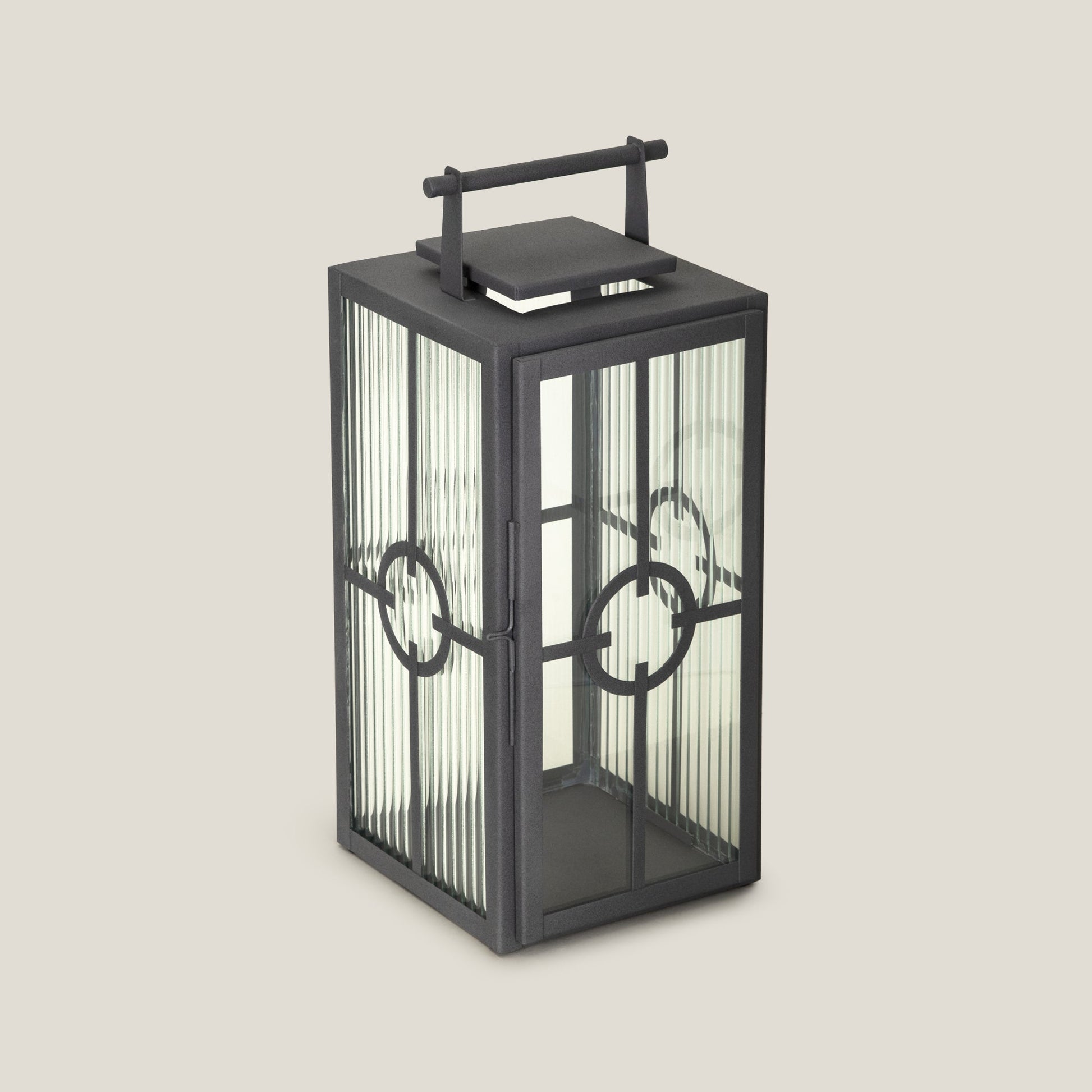 Tavern showcases a sleek modern design. Its cuboidal iron frame features two sides with vertically ribbed textured glass and two with plain glass panels. A striking circular iron detail at the center is complemented by intersecting strips across all sides, finished in elegant powder-coated black. This contemporary lantern adds a stylish, sophisticated touch to any space.